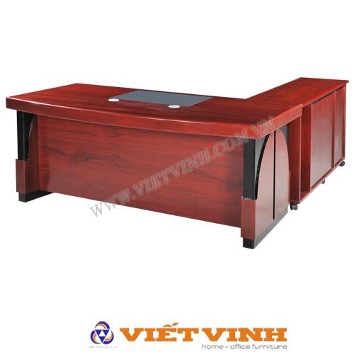 Bàn lãnh đạo mặt lượn cong, trên mặt có tấm PVC trang trí, chân bàn ghép nổi.