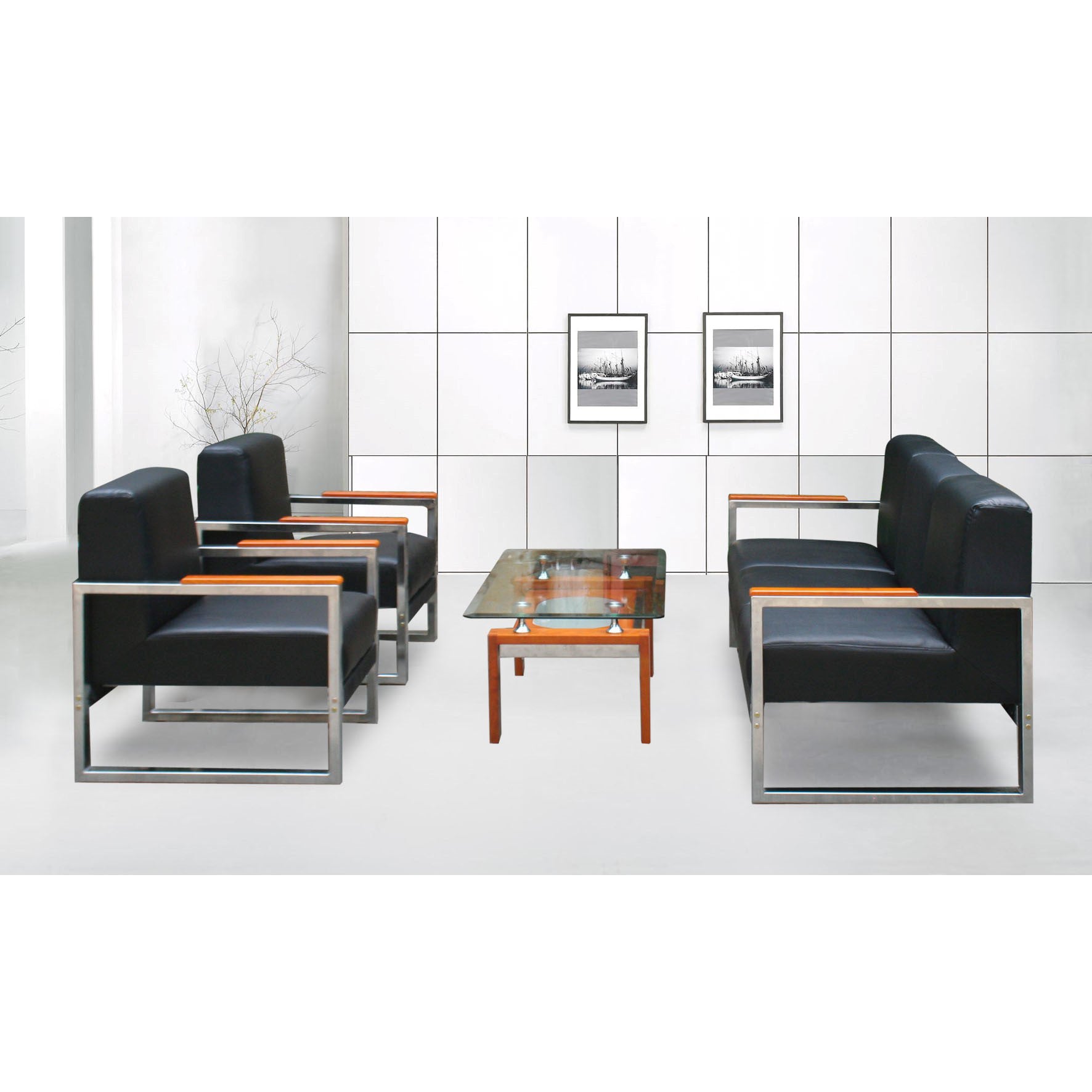 | Chất liệu | Bộ ghế Sofa khung thép có đệm tựa bọc da tại các vị trí tiếp xúc với người sử dụng hoặc PVC gồm: 02 ghế đơn, 01 ghế băng. (Giá chưa bao gồm bàn) |