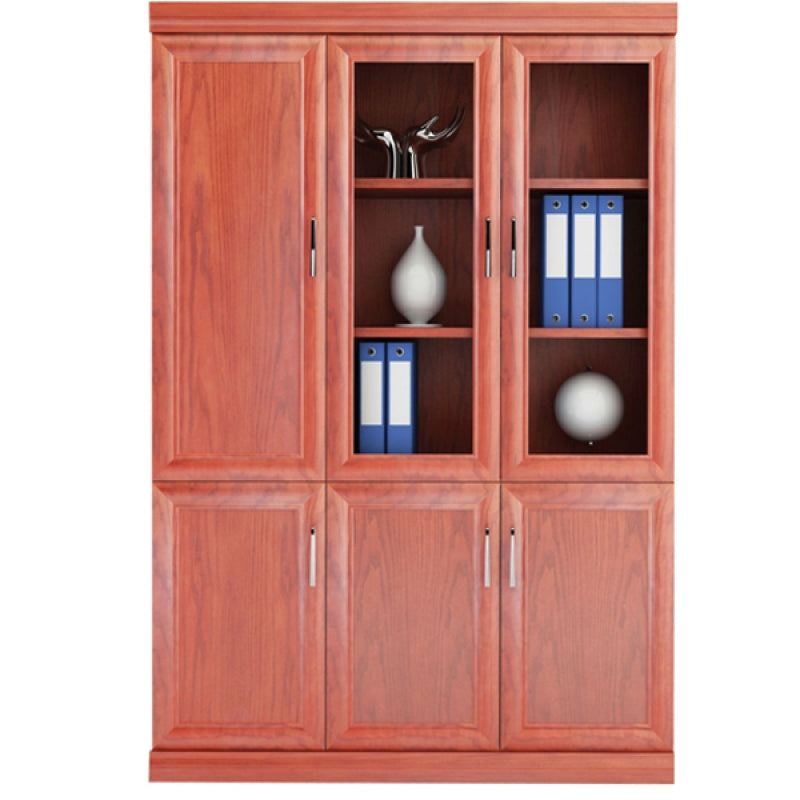 Tủ tài liệu 3 buồng, phía trên có 2 khoang cánh kính mở để tài liệu và 1 khoang cánh dài. Phía dưới 3 cánh gỗ mở.