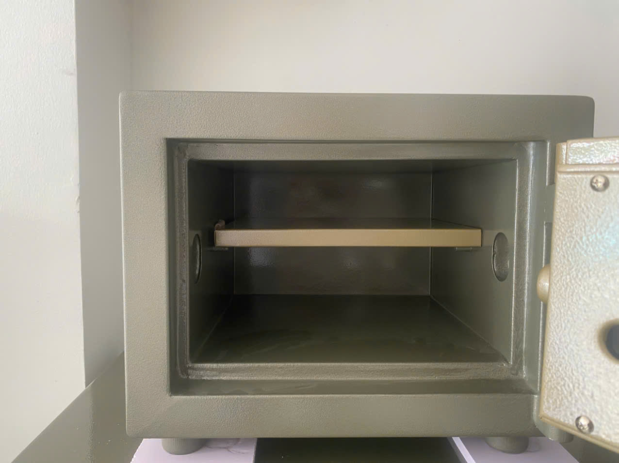 Mở cửa nhấn nút bên trái đằng sau cánh cửa cho chốt khoá bật ra (đối với két lớn) hoặc xoay chìa khoá qua trái (đối với két nhỏ)